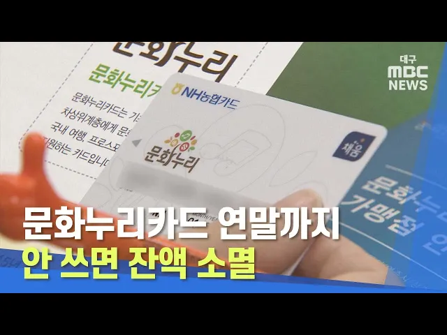 대구시는 2021년 문화누리카드를 올해 안에 쓸 것을 당부했습니다.올해 12만 5천여 명이 문화누리카드를 신규 발급했거나 재충전했는데 올해 안에 쓰지 않으면 금액이 이월되지 않고 모두 소멸됩니다.문화누리카드는 6살 이상 기초생활수급자와 차상위계층에게 문화예술과 여행, 체육활동을 1인당 연간 10만 원 지원하는 제...