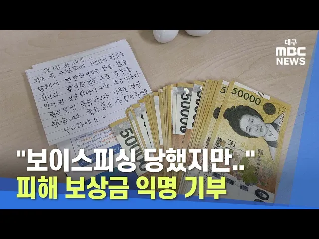 보이스피싱 피해자가 보상금을 대구사회복지공동모금회에 기부했습니다.대구사회복지공동모금회에 따르면 지난 15일 익명의 기부자가 170만 원과 쪽지를 봉투에 담아 퀵서비스로 모금회 사무실로 보냈습니다.쪽지에는 올해 2월에 보이스피싱을 당해 천만 원을 잃었다가 다행히 일부를 보상받아 좋은 일에 동참하고자 기부를...