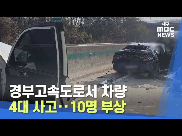 오늘 오후 12시 50분쯤 경북 칠곡군 경부고속도로에서 부산 방향으로 달리던 승용차가 중앙분리대를 들이받는 사고가 났습니다.이후 사고를 피해 멈춰선 차량 2대를 뒤따르던 차량이 다시 들이받으면서 2차 사고가 났습니다.이 사고로 승용차 운전자 등 10명이 다쳐 병원으로 옮겨졌습니다. 경찰은 정확한 사고 경위를 조사...