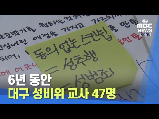 정의당 대구시당에 따르면 최근 6년 동안 성비위 사건으로 징계받은 대구지역 교원은 47명입니다. 이들 중 교사가 42명으로 많고 교감이나 교장 5명, 피해자는 학생 24명, 교직원 10명, 일반인 13명 등입니다.유형별로는 성희롱 21건, 성매매 7건, 성폭력 16건, 불법 촬영이나 촬영물 유포 2건 등입니다.일반인 대상 성폭력...