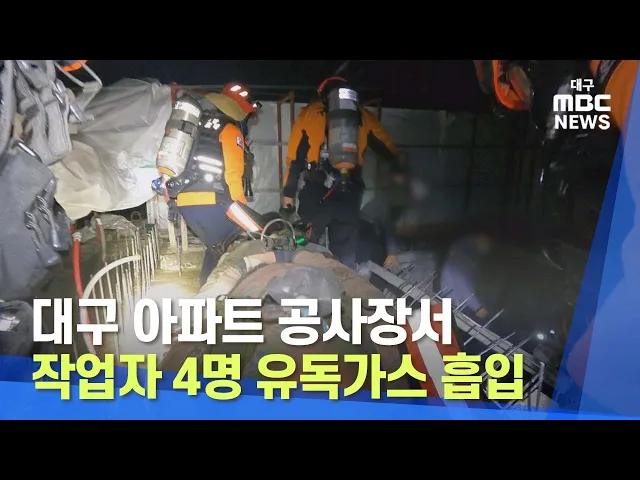어제(4일) 오후 7시20분쯤 대구 수성구 욱수동의 한 아파트 공사 현장에서 작업자 4명이 유독가스에 중독되는 사고가 났습니다.경찰과 소방당국은 작업자들이 콘크리트를 굳히기 위해 천막으로 주변을 막고 갈탄을 피우다 연기를 들이마셔 사고가 난 것으로 보고 있습니다.외국인 3명을 포함한 작업자 4명은 병원으로 옮겨...