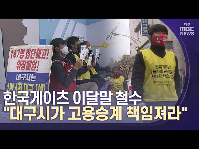 ◀앵커▶흑자 폐업과 해고에 항의해 단식 농성을 벌이던 한국게이츠 노동자들이 오늘부터 대구시청 로비에서 농성을 시작했습니다.회사 청산 절차가 거의 마무리 단계지만 대구시가 수수방관하고 있다며 고용 승계 문제를 대구시가 책임지고 해결하라고 요구했습니다.도건협 기잡니다.◀도건협 기자▶한국 게이츠 해고 노동자들...
