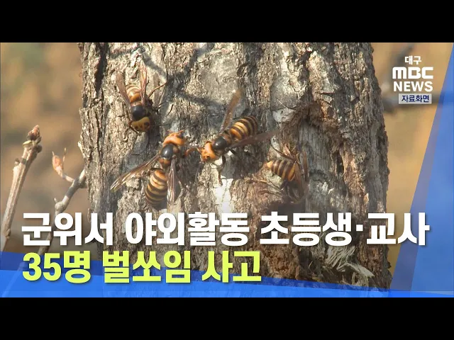 오늘 오전 10시 10분쯤 군위군 군위군민회관 뒷산에서 야외활동을 하던 초등학생 32명과 교사 3명 등 35명이 벌에 쏘였습니다.학생과 교사들은 구급차 등으로 인근 병원 3곳으로 이송됐는데, 지금까지 중증환자는 없는 것으로 알려졌습니다.소방당국은 초등학생과 교사 90여 명이 산에서 야외활동을 하다 벌집을 건드려 벌...
