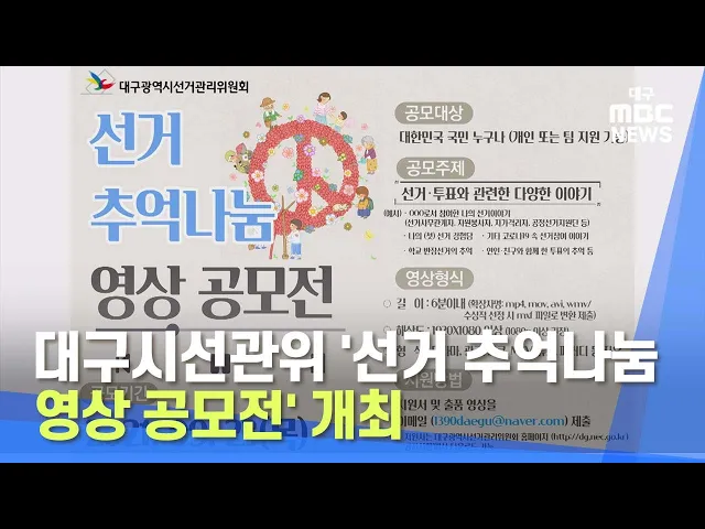 대구시선거관리위원회는 내년 대선과 지방선거를 앞두고 '선거 추억 나눔 영상 공모전'을 개최합니다.대구시선관위는 '선거·투표와 관련한 다양한 이야기'를 주제로 공직선거와 반장 선출 같은 생활 주변의 선거 등을 통해 경험과 추억을 표현한 영상으로 공모하며 오는 23일부터 10월 24일까지 선관위 이메일로 접수합니다...