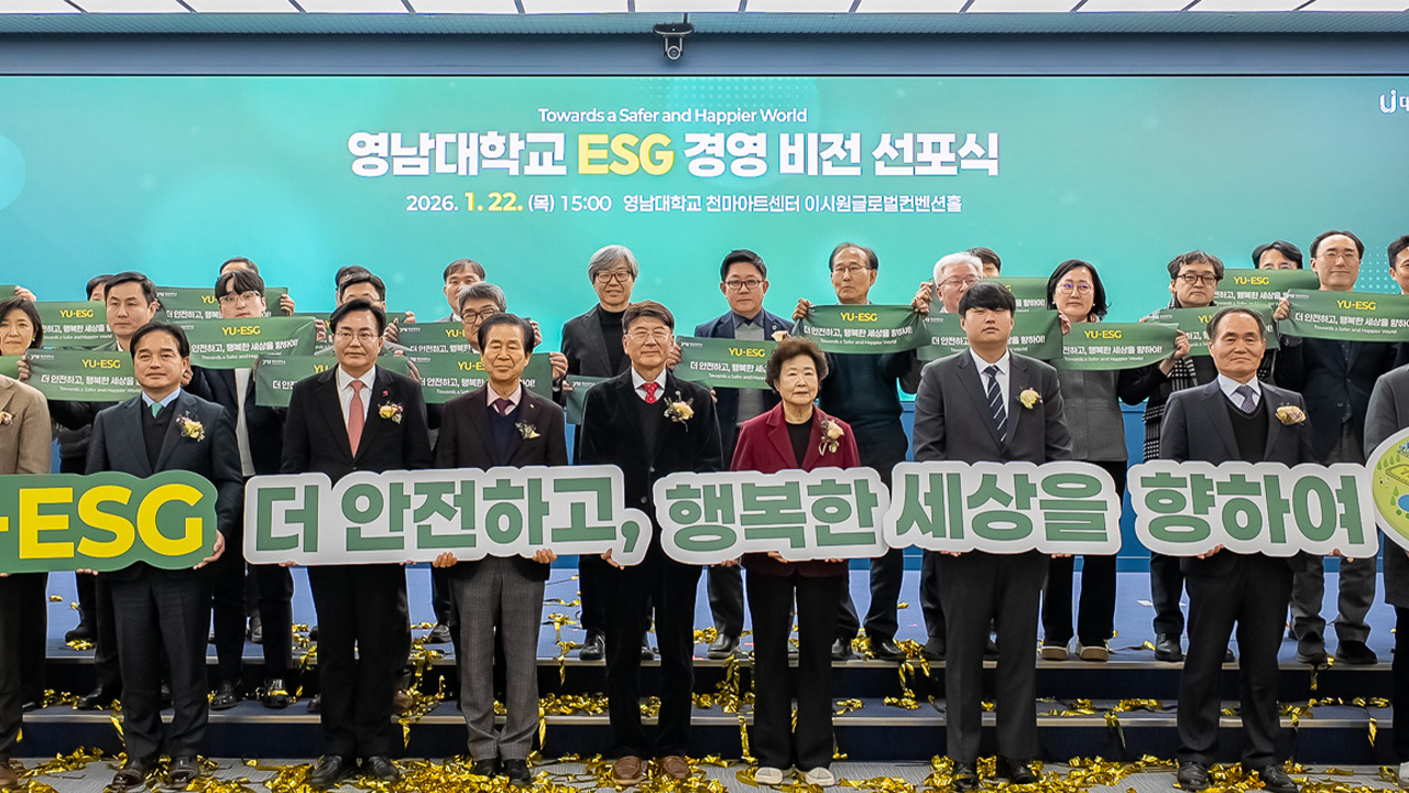 영남대학교는 지속가능성을 달성하기 위한 3가지 핵심 요소인 'ESG 경영 비전'을 선포했습니다.영남대는 ESG 경영을 대학의 핵심 운영 철학으로 정립하고, 대학 구성원뿐 아니라 지역 사회에 공유함으로써 실천 중심의 ESG 경영 기반을 다지기로 하고, 지난 1월 22일 천마아트센터에서 선포식을 열었습니다.ESG를, 외부 평...
