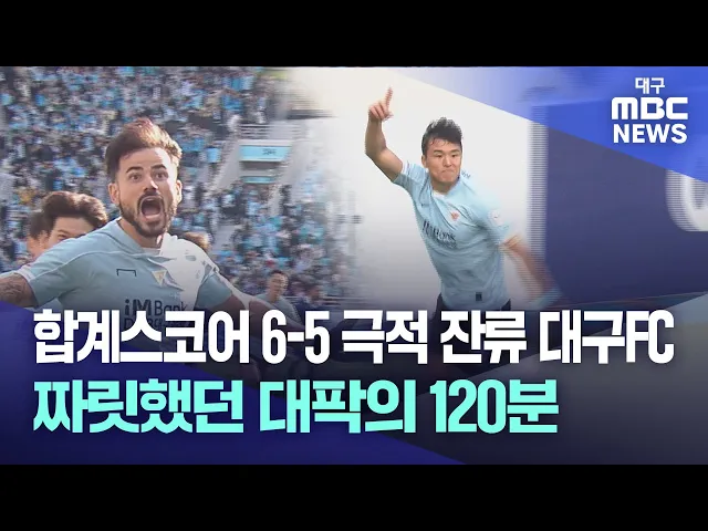 ◀ 앵 커 ▶연장까지 이어진 승부 끝에 대구FC가 다음 시즌에도 K리그1 무대에 함께 합니다.12월 1일 오후 DGB대구은행파크에서 펼쳐진 충남아산과의 하나은행 K리그 2024 승강 플레이오프 2차전에서 2골 차 승리로 잔류를 결정지은 건데요.치열했던 120분간의 승부, 석원 기자가 그 현장을 다녀왔습니다.◀ 기 자 ▶3-4로 마무...