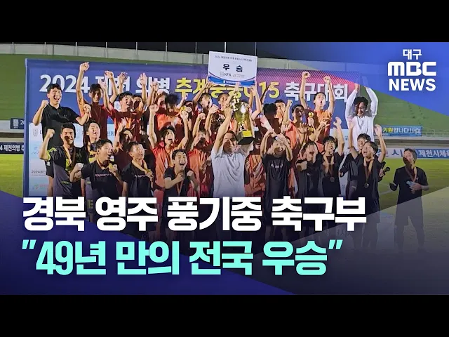 ◀앵커▶대한축구협회가 주최한 전국 중등 축구대회에서 경북 영주 풍기중학교가 창단 49년 만에 우승을 거머쥐었습니다.전교생 수가 10배 더 많은 수도권 학교를 잇따라 꺾고 이룬 기적에, 지역에선 선수들을 위한 카퍼레이드까지 열렸습니다.이도은 기자가 보도합니다.◀기자▶경북 영주 풍기중 축구부 학생들이 카퍼레이드로...