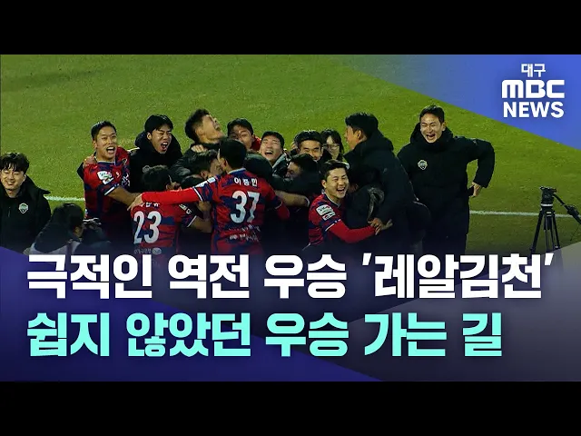 ◀앵커▶하나원큐 K리그2 2023에서 김천상무가 말 그대로 '극적인 역전 우승'을 이뤄냈습니다.개막을 앞두고 우승 후보로 손꼽히다가 리그 막판 부산에 밀려 자력 우승이 불가능했지만, 끝까지 포기하지 않고 한 편의 드라마를 만들었는데요,K리그1 무대 복귀를 이뤄낸 김천상무의 이번 시즌, 석원 기자가 정리했습니다.◀기자...