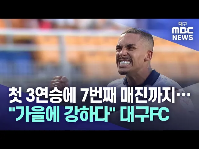 ◀앵커▶프로축구 대구 FC가 최근 3연승을 달리며 상위권 진입을 노리고 있습니다.팀의 핵심 전력인 세징야를 비롯해 주전 선수들이 빠진 가운데 일궈낸 연승이라서 더 값진 결과로 평가받고 있는데요,다가오는 일요일 홈에서 펼쳐지는 31라운드는 7번째 매진을 기록할 만큼 팬들의 관심이 뜨겁습니다.대구FC의 가을 전망을 ...