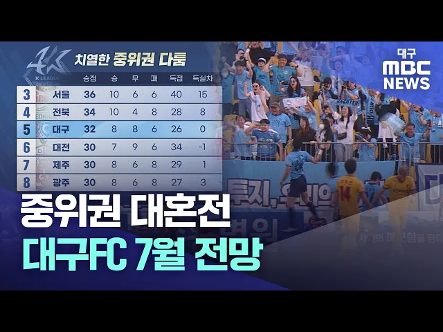 ◀앵커▶K리그 중위권 순위표가 하루가 다르게 요동치고 있습니다.아직 리그 중반이지만, 상위 스플릿에 해당하는 6위권 진입을 위한 경쟁이 치열합니다.22라운드를 마친 시점에서 대구FC 순위는 5위, 하지만 3위부터 8위의 승점 차는 6점에 불과해 2, 3경기 만에 수직 상승과 하락이 가능한데요.대구에겐 앞으로 2경기가 매...