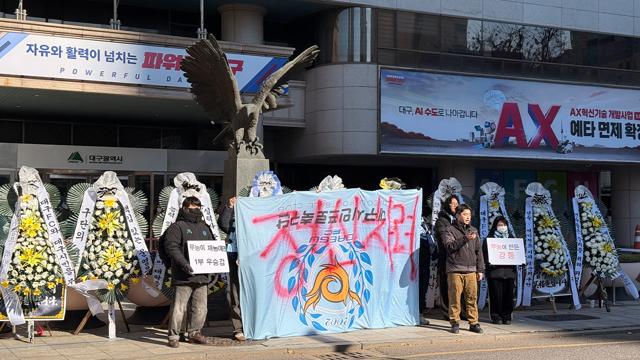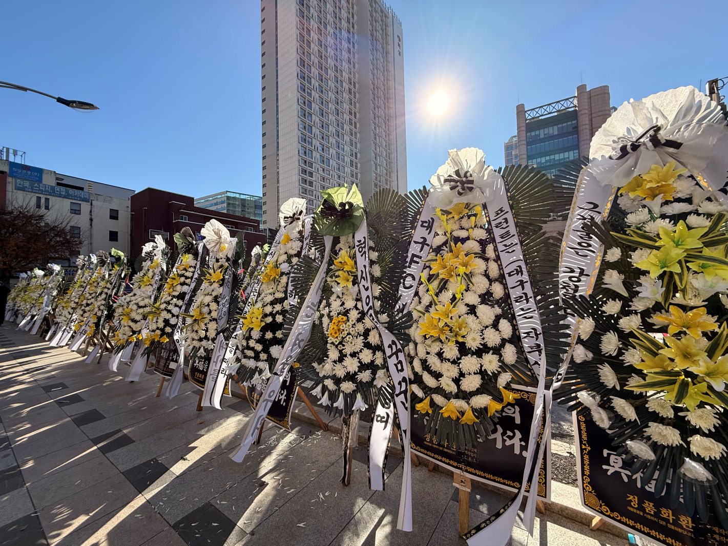 대구시청 동인 청사 앞에 대구FC의 강등과 후속 조치에 대한 팬들의 불만이 남긴 200여 개의 근조화환이 깔렸습니다.12월 5일 오전 10시 반부터 대구FC 서포터즈 연대 그라지예는 '대구FC 쇄신 촉구 근조화환 시위'를 실시하고 있습니다.2025시즌 최하위로 결국 자동 강등의 수모를 피하지 못한 대구FC에 대한 불만과 쇄신 ...