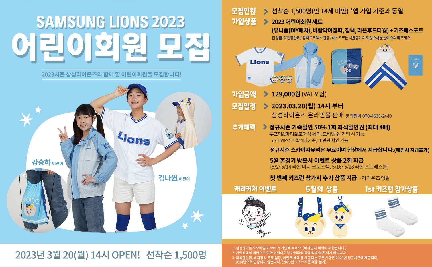프로야구 삼성라이온즈가 2023년 어린이회원을 모집합니다.어린이회원에게는 유니폼과 바람막이 점퍼, 후드타월, 짐쌕 등이 주어지고 본인에 한해 스카이 자유석에서 무료 관람 혜택도 있습니다.정규시즌 사용 가능한 가족 관람 50% 할인 쿠폰을 제공하고 어린이회원들을 대상으로 한 5월 이벤트를 통해 추가 기념품 제공 ...