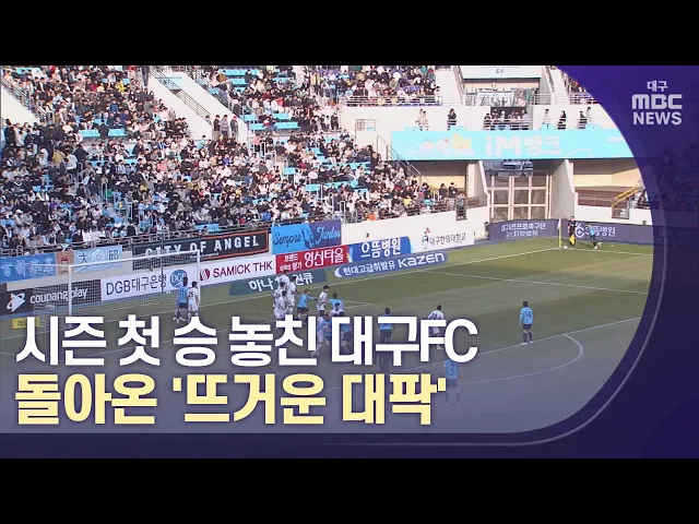 ◀앵커▶ 포항 원정 역전패로 아쉽게 2023시즌을 시작한 대구FC가 오늘 DGB대구은행파크에서 열린 홈 개막전에서 무승부로 마무리해 시즌 첫 승에 도전에 실패했습니다.DGB대구은행파크에는 1만여 명의 관중이 찾아 코로나19 이전과 같은 뜨거운 '축구의 봄', 그 시작을 함께했습니다.그 현장, 석원 기자가 다녀왔습니다. ◀기...