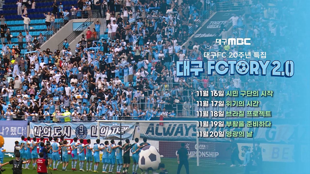 2002한일월드컵이 만든 큰 흔적 가운데 하나라면 시민구단 대구FC를 빼놓을 수 없을 겁니다. 2022년으로 창단 20주년을 맞이한 대구FC의 지난 20년을 돌이켜보기 위해 대구MBC스포츠가 특별 기획을 준비했습니다. 지금까지의 시간을 돌이켜보며 우리들의 축구단, 대구FC가 걸어온 길을 통해 내일을 생각해보는 '대구FCtory...