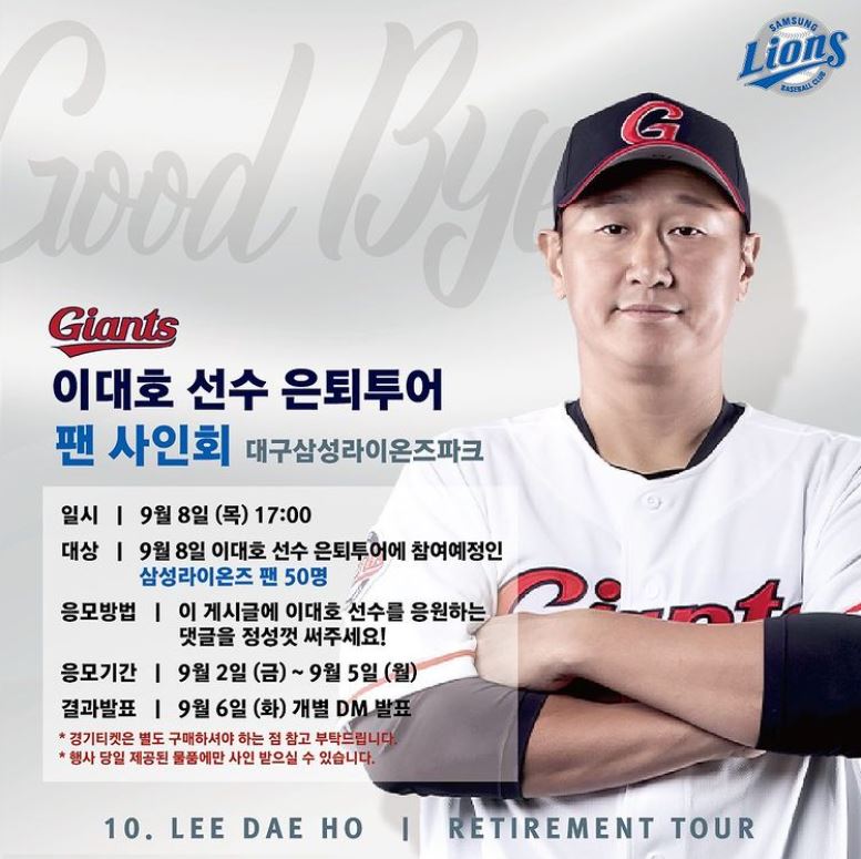 삼성라이온즈가 9월 8일 저녁 대구삼성라이온즈파크에서 롯데자이언츠와 이대호 선수 은퇴 투어 행사를 진행합니다.이번 은퇴 투어는 사전에 SNS 이벤트를 통해 선정된 삼성 팬 50명과 롯데 팬 50명을 대상으로 이대호 선수 팬 사인회를 진행하고 경기 시작 전 삼성이 준비한 기념 영상과 편지, 선물을 전달할 예정입니다.9...