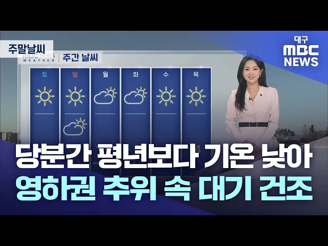 1월 4주 차 대구·경북 주말 ‘날씨 체크’이번 주 주말 날씨 포인트 3가지를 전해드립니다.▶ 첫 번째! ‘영하권 추위’첫 번째 포인트는 ‘영하권 추위’입니다.이번 주 강추위가 맹위를 떨쳤는데요.큰 추위의 고비가 지나고 차차 한파특보는 해제되거나 약화하는 곳이 있겠습니다.다만 주말에도 아침, 저녁으로 영하권 추위가 예...