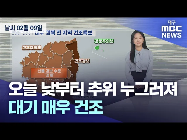 2월 2주 차 대구·경북 ‘날씨 체크’ 시작합니다.추위의 기세가 조금씩 꺾이고 있는데요.월요일 낮부터는 차차 기온도 오름세 예상됩니다.대구와 경북 전 지역에는 계속해서 건조특보가 이어져 산불 및 각종 화재가 발생하지 않도록 주의가 필요합니다.건조특보가 길에 이어지며 크고 작은 화재 소식이 많아지고 있는데요.산...