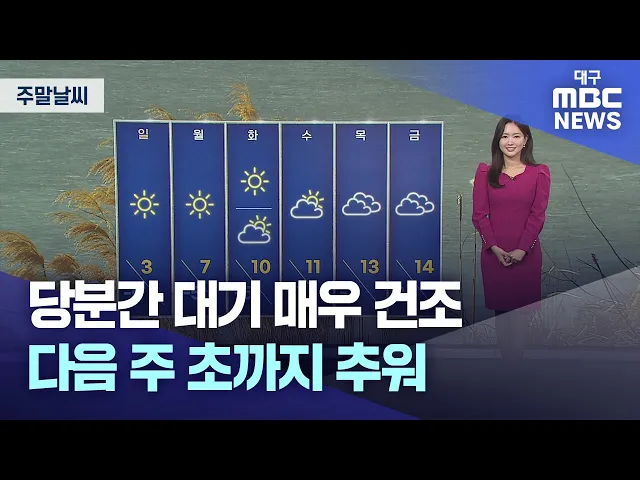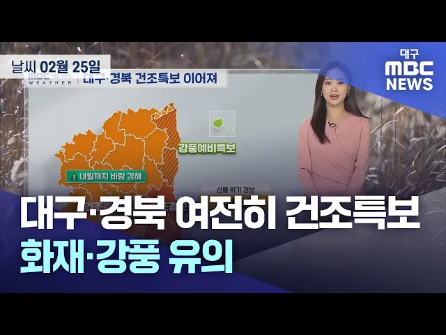 2월 25일 화요일 대구와 경북 지역은 구름 많은 가운데 대기가 건조하겠습니다.경북 북동 산지와 동해안에 건조경보가, 대구와 그 밖의 경북에는 건조주의보가 발효 중입니다.아침 최저 기온은 대구 영하 3.1도, 안동 영하 7도, 포항 영하 0.4도 등을 보였습니다.낮 최고 기온은 대구 11도, 김천과 고령 10도 등 7도에서 11...