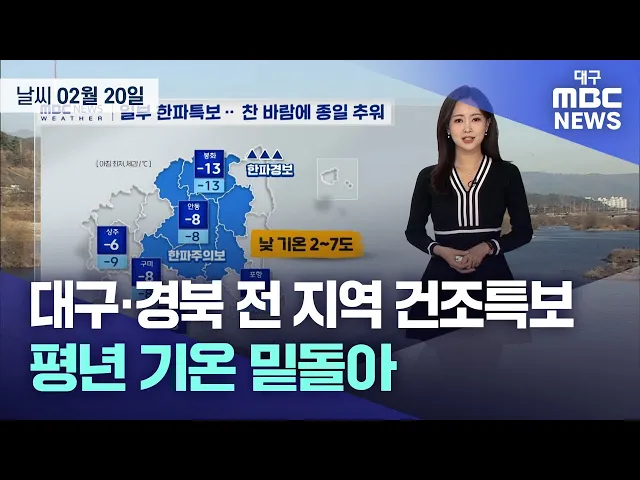 2월 20일 목요일 대구와 경북 지역은 대체로 맑은 가운데 바람 불고 매우 춥겠습니다.경북 북동 산지에는 한파경보가, 북부 내륙에는 한파주의보가 내려졌습니다. 아침 최저 기온은 대구 영하 3.8도, 구미 영하 8.1도, 봉화 석포 영하 15.6도 등을 기록했습니다.낮 최고 기온은 대구 5도 등 2~7도의 분포로 강한 바람에 체...