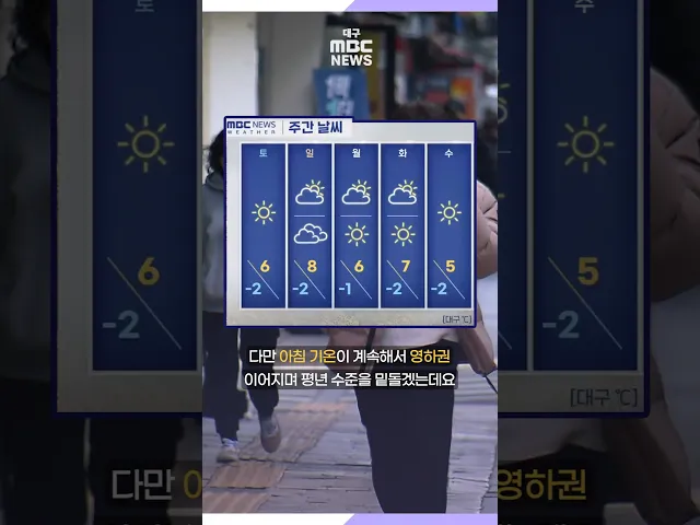 오늘은 기온이 잠시 주춤합니다.금요일 대구의 아침 기온 2도로 대부분 지역에서 어제보다 조금 올랐는데요.낮 기온은 최고 8~9도 안팎 예상됩니다.다만 주말 동안 다시 기온이 낮아져 경북내륙을 중심으로 아침 기온이 -5도 내외로 떨어지는 곳이 있겠고요.낮에도 기온이 크게 오르지 못해 쌀쌀하겠습니다.더불어 바람도 ...