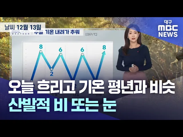 12월 13일 금요일 대구와 경북 지역은 대체로 흐린 가운데 경북 서부 내륙에는 늦은 오후부터 저녁 사이 눈이나 비가 오겠습니다.예상 적설량은 1mm 안팎, 예상 강수량은 1mm 안팎입니다.그 밖의 지역에는 눈발이 날리거나 빗방울이 떨어지는 곳이 있겠습니다.낮 최고 기온은 대구 8도 등 5도에서 9도로 전날보다 조금 낮겠...