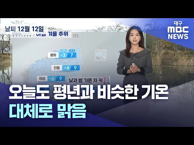 대구·경북 지역은 맑다가 오후부터 구름이 많겠고 아침, 저녁으로 춥겠습니다.12월 12일 목요일 아침 최저 기온은 대구 영하 2.4도, 안동 영하 5.1도, 의성 영하 6.5도 등이었습니다.낮 최고 기온은 대구 9도 등 6~10도의 분포로 전날보다 2도가량 낮겠습니다.경북 동해 바다에는 풍랑주의보가 내려졌습니다.금요일은 대체...