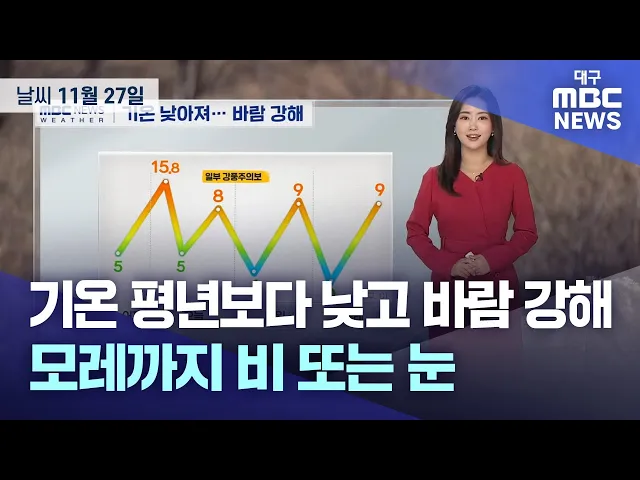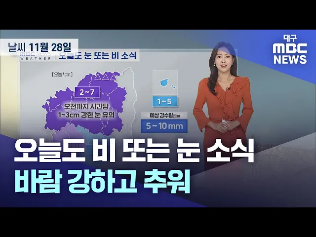 11월 27일 수요일 대구와 경북 지역은 가끔 비나 눈이 오겠고 춥겠습니다.경북 북동 산지에는 대설주의보와 강풍주의보가 발효 중입니다.목요일까지 예상 적설량은 경북 북동 산지 5~10cm, 경북 서부 내륙 2~7cm, 경북 북동 내륙과 중북부 내륙 1~5cm, 대구와 경북 중남부 내륙, 동해안 1cm 안팎입니다.5~10mm의 비가 내리...