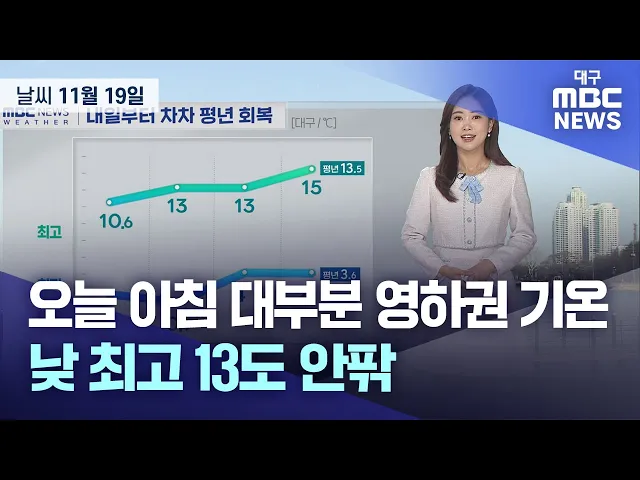 대구·경북 지역은 구름 많은 가운데 밤사이 기온이 영하로 떨어지며 춥겠습니다.11월 19일 화요일 아침 최저 기온은 대구 영하 0.5도, 안동 영하 3.3도, 김천 영하 6.6도 등을 기록했습니다.내륙에는 얼음이 얼거나 서리가 내리는 곳이 많겠고, 동해안은 오전까지 가끔 비가 오겠습니다.낮 최고 기온은 대구 13도 등 10~14...