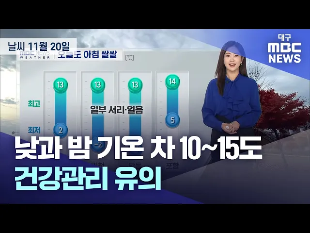 11월 20일 수요일 대구와 경북 지역은 가끔 구름 많은 가운데 쌀쌀한 날씨가 이어지겠습니다. 낮 최고 기온은 대구와 김천 13도, 고령 14도 등 11도에서 15도로 전날보다 조금 높겠습니다. 미세먼지는 '보통' 수준이 예보됐습니다. 목요일은 가끔 구름이 많겠고 일교차가 크겠습니다. 아침 최저 기온은 대구 4도 등 1도에서...