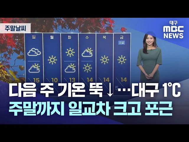 한 달 전만 해도 푸르렀던 산이, 이제는 완연한 가을의 옷을 입었습니다.하늘은 파랗고, 단풍은 알록달록 붓으로 그려낸 듯 다채로운 가을빛이 가득한데요. 지각 단풍을 더 즐기라는 의미일까요? 최근 평년보다 온화한 기온이 이어지고 있습니다. 다가오는 주말에도 포근한 가을 날씨 예상되는데요. 주말 낮 기온도 20도를 ...