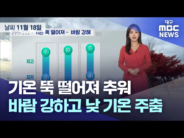 11월 18일 월요일 대구와 경북 지역은 바람 불고 매우 춥겠습니다.아침 최저 기온은 대구 2.8도, 안동 영하 0.6도, 의성 영하 3.9도 등 내륙을 중심으로 곳곳에서 영하권을 기록했고 얼음이 얼고 서리가 내린 곳도 많겠습니다.낮 최고 기온은 대구 9도 등 8~11도의 분포로, 전날보다 5~8도가량 낮겠고 찬바람이 불어 체감온...