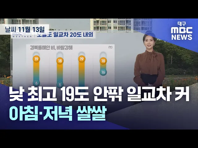 11월 13일 수요일 대구와 경북 지역은 구름 많은 가운데 경북 동해안에는 오전까지 5mm 안팎의 약한 비가 오는 곳이 있겠습니다.아침 최저 기온은 대구 6.5도, 안동 4.6도, 포항 12.9도 등을 보였습니다.낮 최고 기온은 대구 19도, 영천 18도, 고령 20도 등 16도에서 20도로 전날보다 2~3도가량 낮겠습니다. 대구지방기상청...