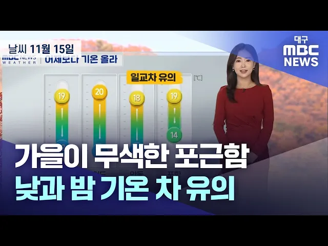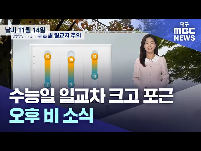2025학년도 수능일이 밝았습니다.오늘은 일교차에 대비할 수 있는 겉옷과 작은 우산 챙기시면 좋겠는데요.자세한 기온 살펴보시면 오늘 아침 대구와 안동의 기온 7도, 포항 11도 가리키고 있습니다.낮에는 대부분 지역에서 최고 20도 안팎까지 올라 포근하겠고요.낮과 밤의 기온차가 크게 벌어져 급변하는 기온에 대비해 건...