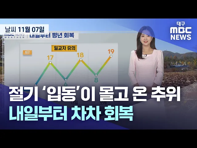 절기 ‘입동’이 추위를 몰고 왔습니다.북쪽에서 찬 공기가 남하하면서 수요일 아침 대구와 경북 대부분 지역에서 전날보다 5도가량 기온이 내려갔는데요. 갑자기 낮아진 기온에 우리 지역은 올가을 들어 가장 낮은 기온을 기록한 곳이 많았습니다. ▶ 주요 지점 일 최저기온 (6일 06시 30분 기준, 단위: ℃)□ 옥산(의성) -1.8 ...