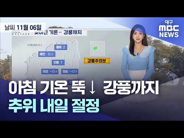 11월 6일 대구와 경북 지역은 대체로 맑은 가운데 춥겠습니다.아침 최저 기온은 대구 7도, 안동 0.1도, 청송 영하 1.8등 올가을 들어 가장 낮은 기온을 보였습니다.낮 최고 기온은 대구와 칠곡 15도, 구미 14도 등 12도에서 16도로 5일보다 3~4도가량 낮겠습니다.대구지방기상청은 순간풍속 시속 55km 안팎의 강한 바람이 ...