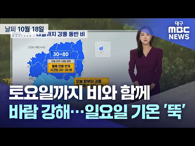 10월 18일 금요일 대구와 경북 지역은 흐린 가운데 곳곳에서 비가 내리고 있습니다.토요일 낮까지 예상 강수량은 경북 북부 30~80mm, 대구와 경북 남부 10~50mm입니다.금요일 오후부터 토요일 새벽 사이 경북 북부에는 돌풍과 천둥, 번개를 동반한 시간당 20~30mm의 강한 비가 쏟아지겠습니다.금요일 한낮 기온은 대구 22도...