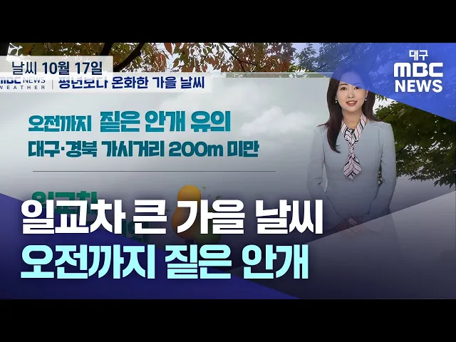 10월 17일 수요일 대구와 경북 지역은 대체로 맑은 가운데 오전부터 구름이 많아지겠습니다.오전까지 가시거리 200m 미만의 짙은 안개가 끼겠고, 이슬비가 내리는 곳도 있겠습니다.아침 최저 기온은 대구 15.2도, 안동 14.8도, 포항 17.6도 등을 보였습니다.낮 최고 기온은 대구 24도, 경산 25도, 구미 23도 등 23도에서 25...