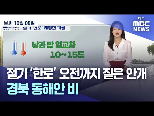 찬 이슬이 맺히기 시작한다는 절기상 한로인 10월 8일 화요일 대구와 경북 지역은 구름이 많다 차차 흐리겠고 곳에 따라 비가 오겠습니다.경북 동해안과 북동 산지에는 오전부터 밤까지 5~10mm, 그 외 내륙에는 오후 한때 1mm 안팎의 비가 예상됩니다.아침 최저 기온은 대구 13.8도, 안동 13.3도, 포항 15.9도 등이었습니다...