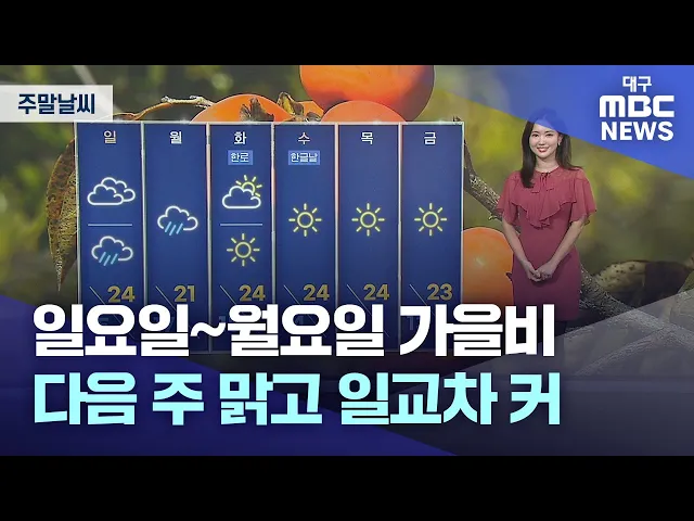 10월 2주 차 대구·경북 '날씨 체크' 시작합니다.월요일 아침 가을비와 함께 시작했습니다. 계절에서 이제야 제대로 가을다움이 느껴지는데요. 이번 주 대체로 맑은 가운데 가을 날씨 즐기시기 좋겠습니다. 우리 지역 10월 2주 차 평년 최저 기온 12.8도, 평년 최고 기온 23.4도였습니다.이번 주 대구와 경북의 기온 평년 수...