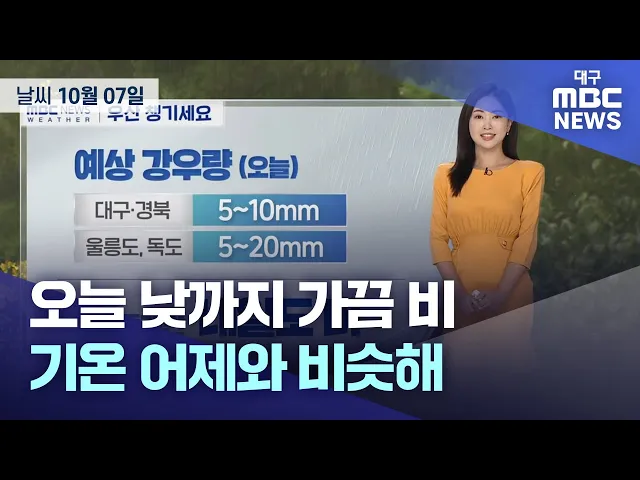 10월 7일 월요일 대구와 경북 지역은 종일 흐린 가운데 가끔 비가 오겠습니다.예상 강수량은 5~10mm입니다.아침 최저 기온은 대구 15.9도, 안동 14.6도, 포항 16.8도 등이었습니다.낮 최고 기온은 대구 22도 등 20~22도의 분포로, 전날과 비슷하겠습니다.화요일은 맑다가 차차 구름이 많겠고 경북 동해안과 북동 산지를 중...