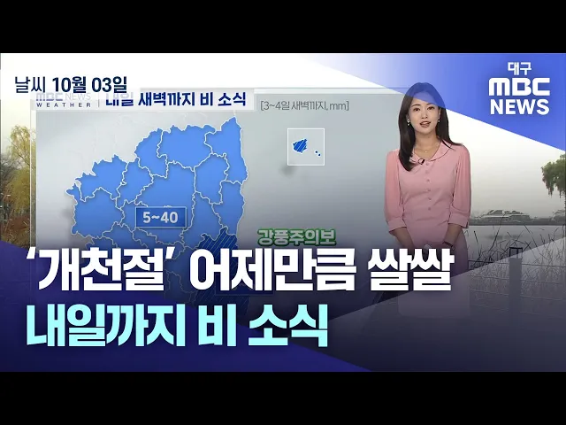 대구와 경북 지역은 선선한 가을 날씨를 보였습니다.10월 2일 수요일 낮 최고 기온은 대구 21.5도, 영천 22.3도, 봉화 19.9도 등 16.5도에서 24.2도의 분포를 보였습니다.개천절인 목요일은 대체로 흐린 가운데 비가 내리겠고 강한 바람도 불겠습니다.금요일까지 예상 강수량은 경북 남부 동해안 10~60mm, 대구와 그 밖의 ...