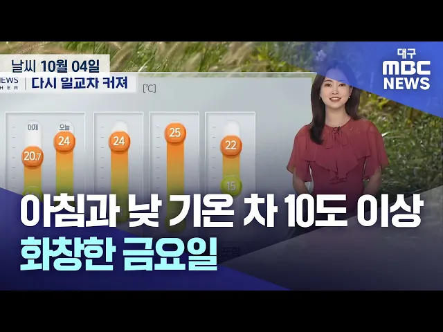 10월 4일 금요일 대구와 경북 지역은 가끔 구름 많은 가운데 일교차가 매우 크겠습니다.아침 최저 기온은 대구 12.6도, 포항 15.2도, 안동 11.3도 등이었습니다.낮 최고 기온은 대구 24도 등 22~25도의 분포로, 전날보다 3~4도가량 높겠습니다.동해 바다에는 풍랑주의보가 발효 중입니다.포항, 영덕 등 해안 지역에도 바람...