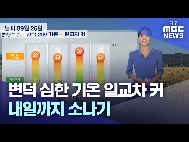 9월 25일 수요일 대구와 경북 지역은 구름이 많은 가운데 한낮에는 25도 안팎으로 다소 더웠습니다. 경북 북동 산지에는 저녁까지 5mm 안팎의 비가 오겠습니다. 낮 최고 기온은 대구 28.2도, 구미 27.9도, 영천 27.3도 등 23.5도에서 28.2도를 보였습니다.9월 26일 가끔 구름이 많겠고 오후에 5~20mm의 소나기가 오겠습니다...