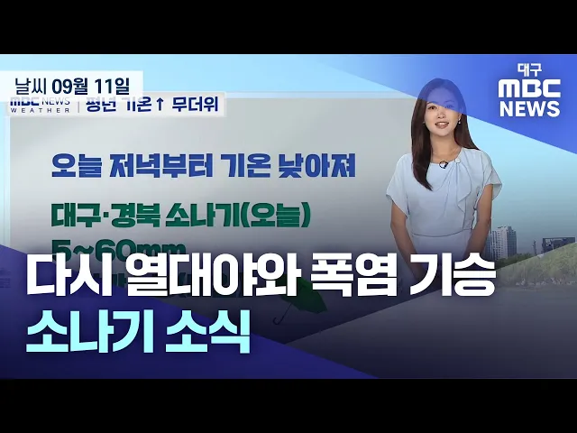 북동 산지와 울진을 제외한 대구·경북 전역에 폭염특보가 내려진 가운데 9월 11일 수요일은 오후부터 소나기가 오는 곳이 많겠습니다.예상 강수량은 5~60mm입니다.비는 천둥·번개를 동반하겠고 시간당 30~50mm로 강하게 쏟아지는 곳도 있겠습니다.밤사이 최저 기온은 대구 25.6도, 경산 25.7도, 포항 26.6도 등 곳곳에서 열...