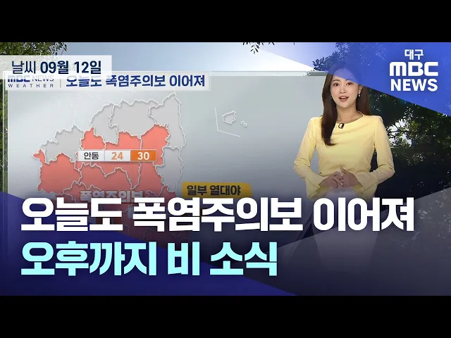 9월 12일 목요일도 대구와 경북 지역은 무더운 가운데 늦은 오후까지 비가 내렸다 그치길 반복하겠습니다.예상 강수량은 5~40mm입니다.밤사이 최저 기온은 칠곡·성주 25.1도, 고령·포항 25.2도 등 일부 열대야가 나타났습니다.현재 대구와 경북 16개 시군에는 폭염주의보가 계속 발효 중입니다.낮 최고 기온은 대구 32도 등...