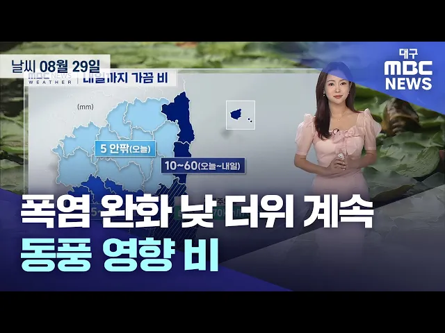 8월 29일 목요일 대구와 경북 지역은 흐린 가운데 곳에 따라 가끔 비가 오겠습니다.예상 강수량은 대구·경북 내륙에 5~40mm, 동해안과 북동 산지에는 금요일까지 10~60mm가량입니다.대구와 경북 대부분 내륙에는 폭염주의보가 계속 발효 중입니다.밤사이 최저기온은 대구·영천 25.2도, 포항 25.4도 등 일부 열대야가 나타났...