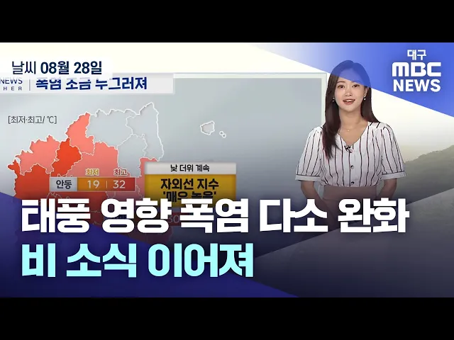 8월 28일 수요일도 흐리고 무더운 가운데 가끔 비가 오겠습니다.대구와 경북 남부 내륙에는 목요일까지 5~60mm, 동해안에는 금요일까지 20~80mm가량 비가 내리겠습니다.북부 일부를 제외한 대구·경북 대부분 지역에 폭염특보가 계속 발효 중입니다.수요일 낮 최고 기온은 대구 32도 등 29~33도의 분포로 습도가 높아 체감온...