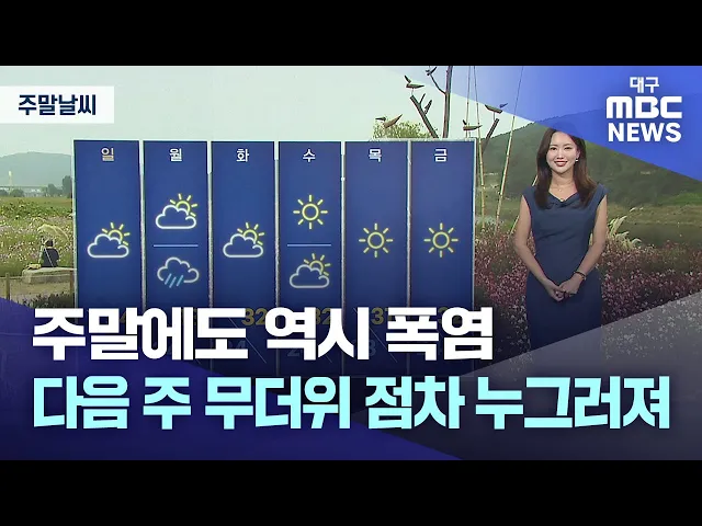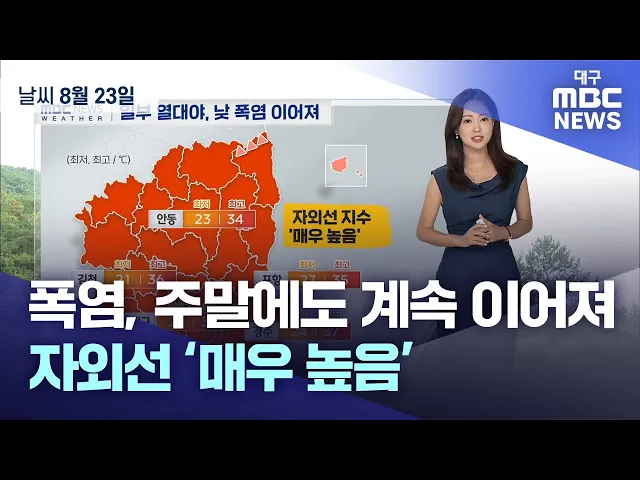 다가오는 주말에도 폭염은 꺾일 기미가 안 보입니다. 오늘도 경북 북동 산지를 제외한 대구와 경북에는 폭염경보가 기승을 부리고 있고요. 대구와 경북 동해안 지역은 밤더위가 이어지며 아침부터 열대야가 나타나고 있습니다. 오늘 우리 지역 자외선 지수도 '매우 높음' 단계 예상되고요. 낮에는 대구와 포항의 기온 35도,...