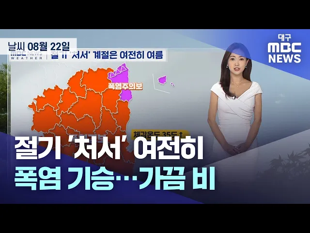 절기상 '처서'인 8월 22일 목요일, 대구와 경북 전역에는 폭염특보가 발효 중입니다.대체로 흐린 가운데 돌풍과 천둥, 번개를 동반한 비가 가끔 오겠습니다.비는 밤이면 대부분 그치겠지만, 경북 북부 내륙은 아침까지 이어지는 곳이 있겠습니다.예상 강수량은 대구와 경북 5~50mm입니다.목요일 낮 최고 기온은 대구와 영천...