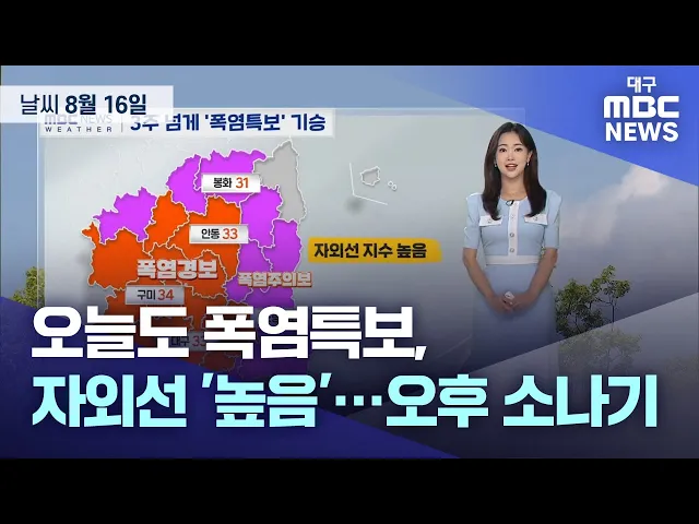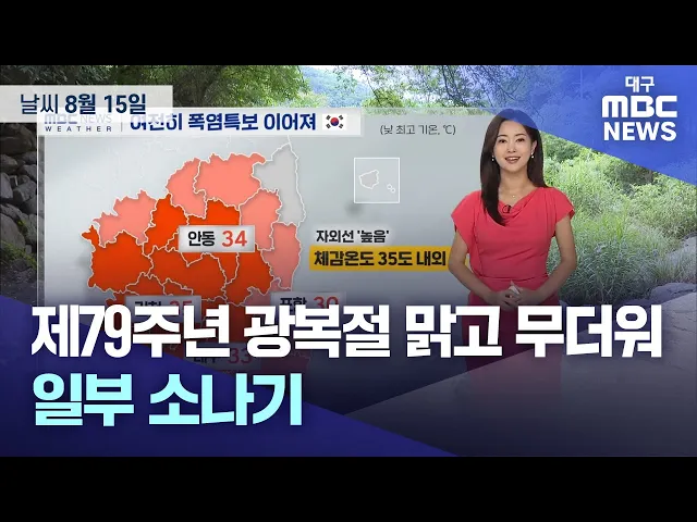 말복인 8월 14일 수요일에도 대구와 경북 지역에는 무더위가 이어졌습니다.대구와 경북 대부분 지역에 폭염특보가 발효 중인 가운데, 낮 최고 기온은 김천 36.2도, 대구 32.6도 등을 보였습니다.저녁까지 경북 남부 동해안에는 5mm 안팎의 소나기가 내리겠습니다.광복절인 목요일은 구름 많은데, 오후에 대구와 경북 남부 ...